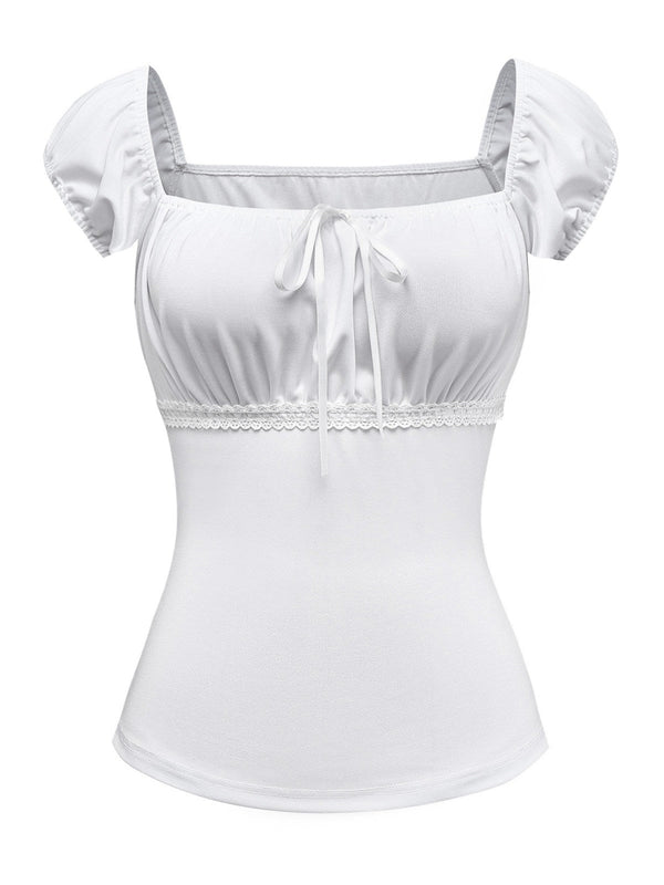 [Prévente] Haut Blanc Dentelle Ruchée Manches Bouffantes Col Carré Ann – Retro Stage-France