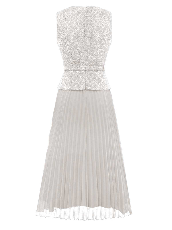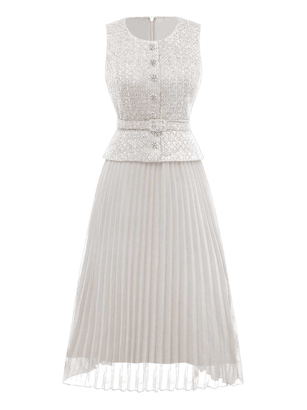 Robe plissée sans manches à boutons nacrés et ceinture années 1960
