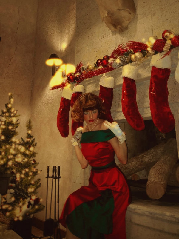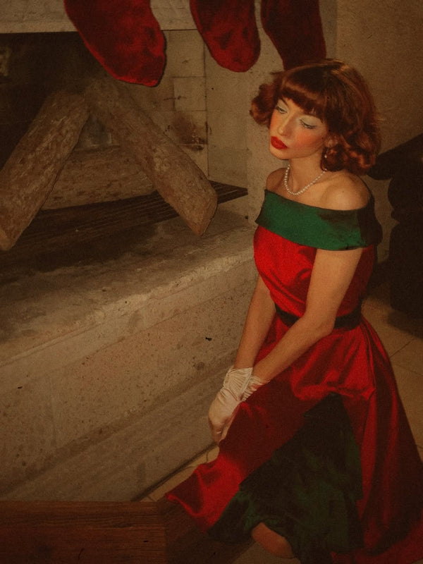Robe à épaules dénudées rouge et verte sapin de Noël des années 1950 – Retro Stage-France