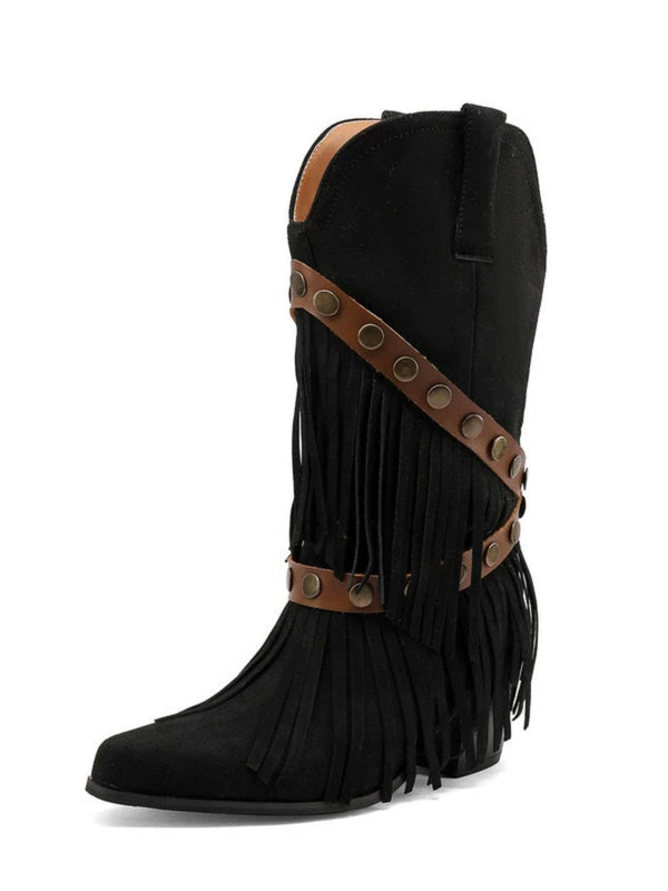 Bottes mi-mollet vintage denim western pompons – Retro Stage-France