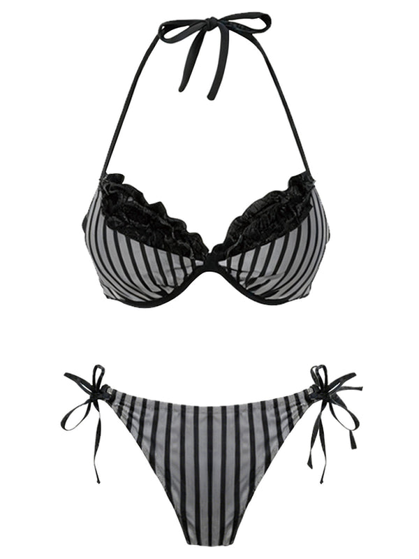 [Prévente] Ensemble bikini gris rayé en maille avec nœud et dos nu ann – Retro Stage-France