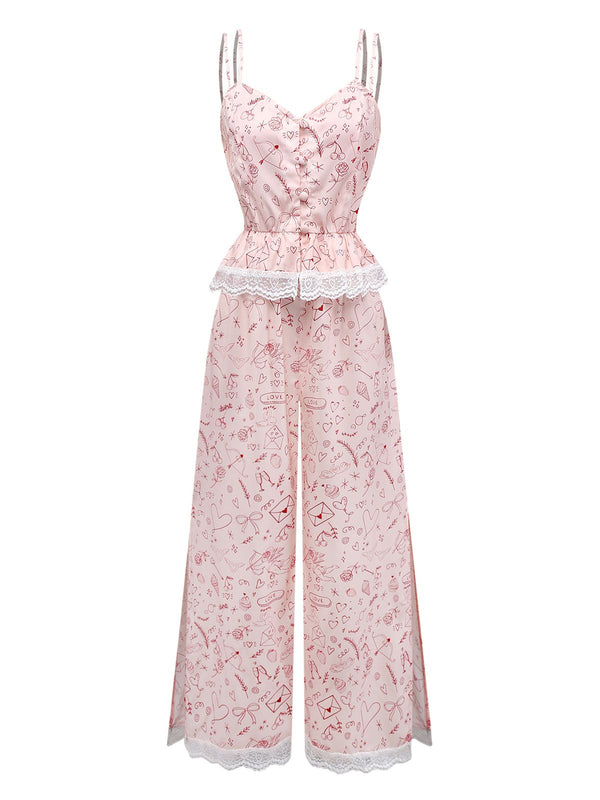[Prévente] Ensemble pyjama camisole rose empiècements en dentelle années 70