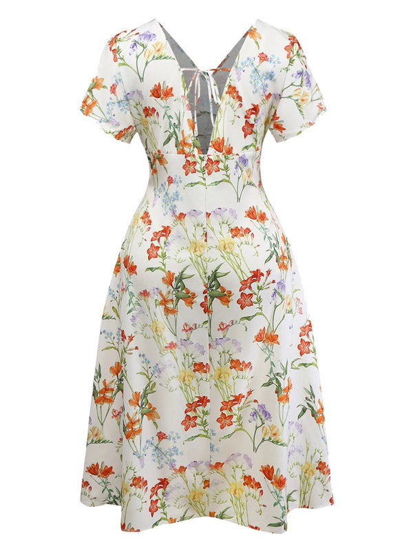 [Prévente] [Grande Taille] Robe blanche à col V et fronces fleuries années 30