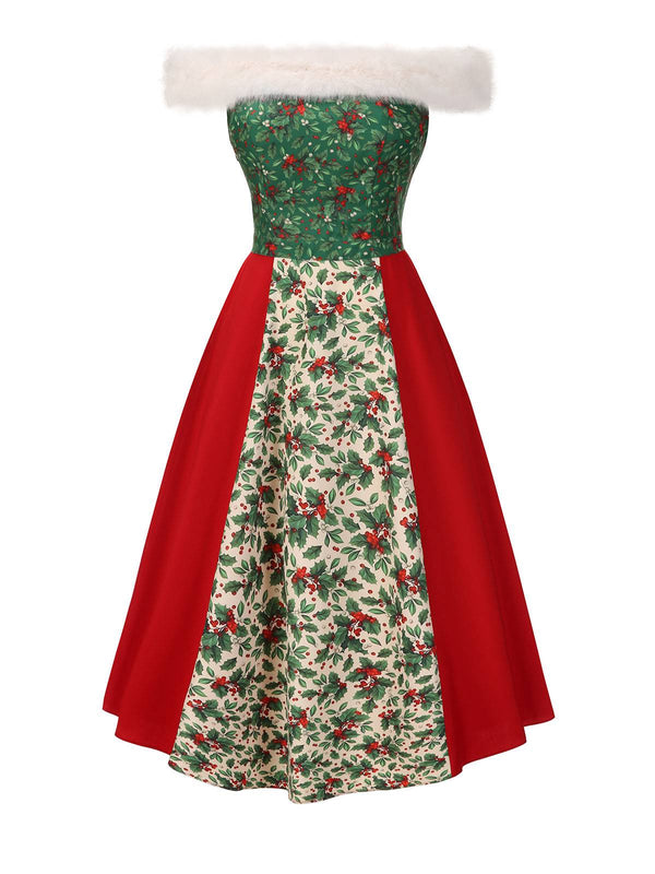 [Pré-vente] Robe de Noël rouge et verte motif houx verticillé col en fourrure années 1940