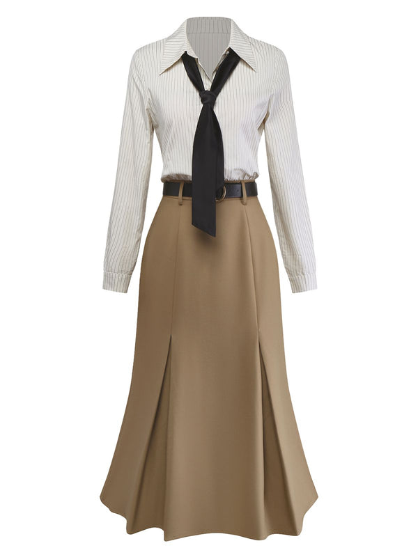 [Prévente] Robe kaki rayé patchwork plissée col revers et cravate années 1930