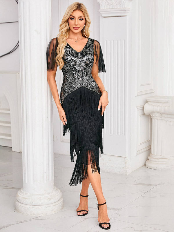 Robe patchwork en maille à sequins et pompons argentés des années 1920 – Retro Stage-France