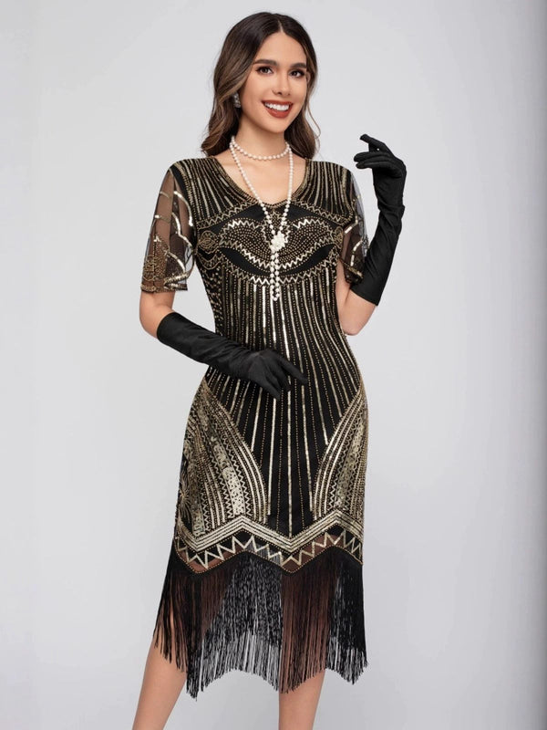 Robe Charleston à paillettes et pompons col rond années 1920 – Retro Stage-France