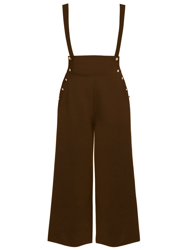 Pour des aventures audacieuses, mesdames ! Un fabuleux basique rétro dans un marron uni, ce pantalon à bretelles sensationnel est confectionné dans un tissu tissé léger pour un ajout aéré à votre ensemble. La taille haute à bandes est cintrée avec des boutons tandis que les bretelles classiques sont sécurisées avec des boutons et facilement amovibles pour un port polyvalent tout en pouvant être facilement ajustées pour une coupe flatteuse.