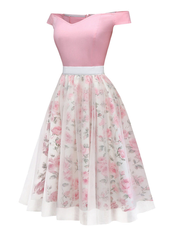 [Prévente] Robe rose épaules dénudées et décolleté cœur en résille années 50