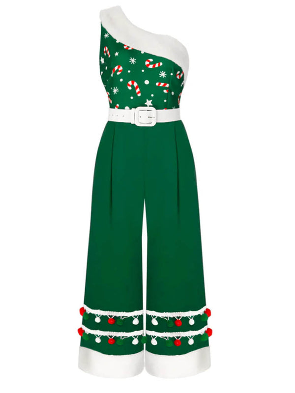 [Pré-vente] [Grande taille] Combinaison verte Noël col oblique en peluche et ceinture années 1950