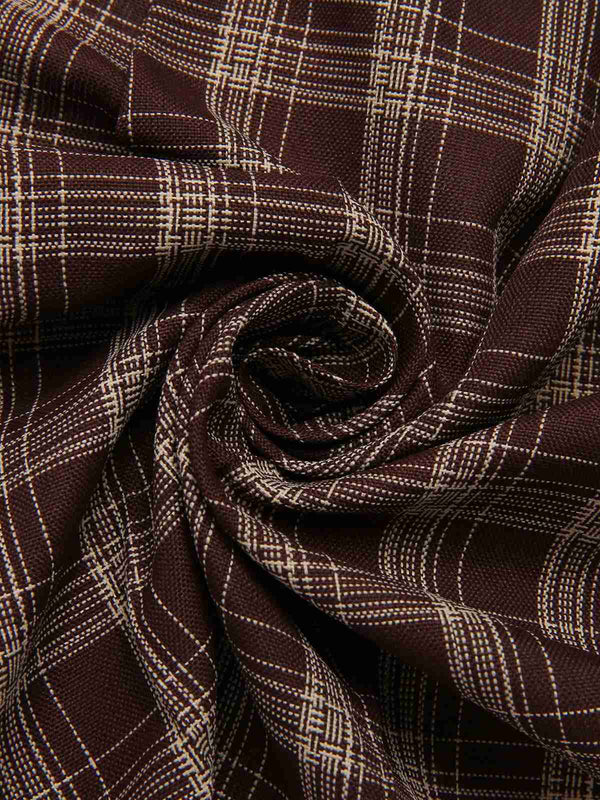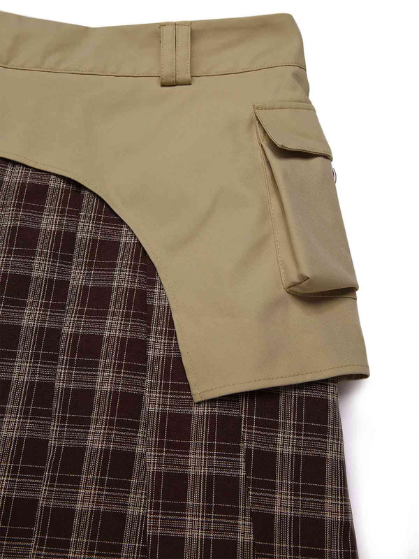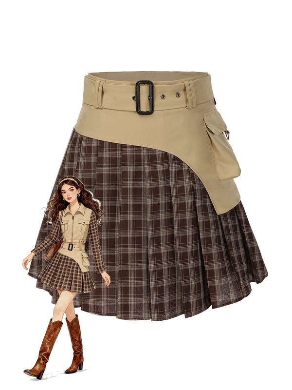 [Pré-vente] Jupe plissée à carreaux en patchwork marron avec ceinture des années 1960