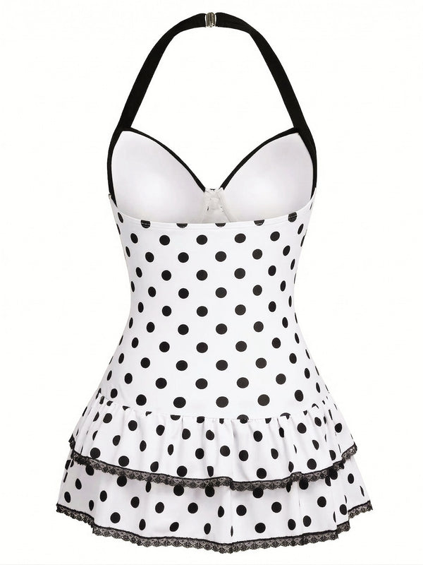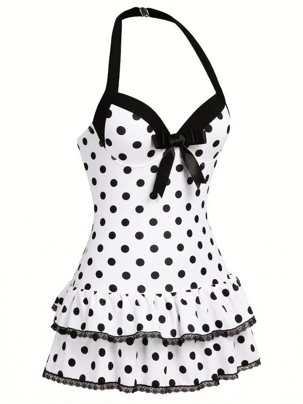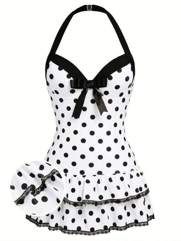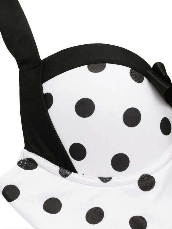 Rehaussez votre style estival avec le maillot de bain une pièce rose années 40 à pois et nœud de Retro Stage. Doté d'un charmant tissu rose à pois noirs classiques, ce maillot de bain capture l'essence de l'élégance vintage.