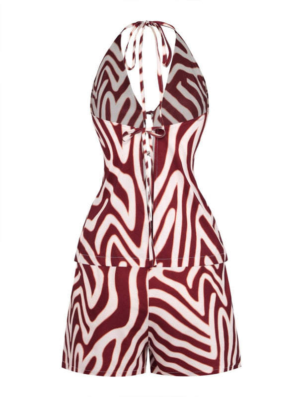 2PCS Haut rayé marron col V profond short 1970s – Retro Stage-France