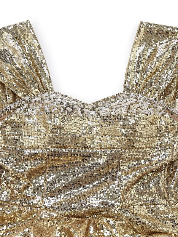 Robe de soirée dorée sequins épaules dénudées années 1980