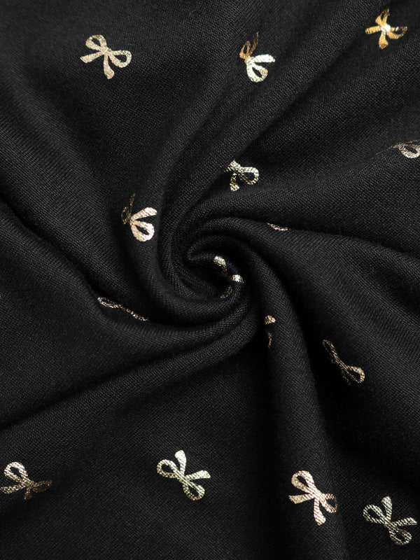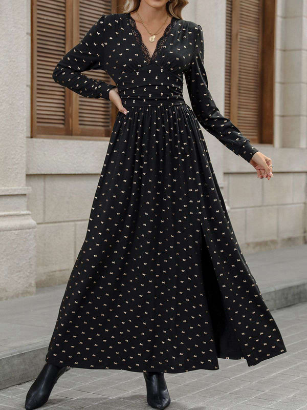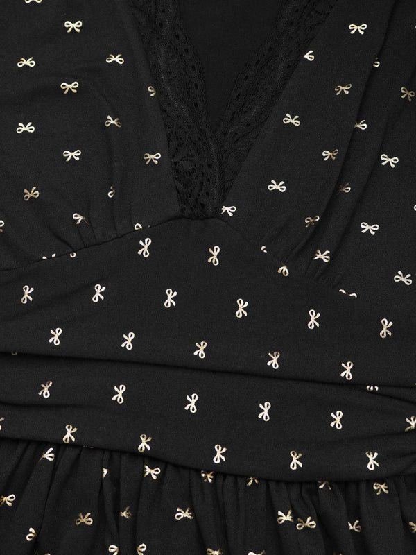 Robe fendue en dentelle noire col en V et nœud en feuille d'or des ann – Retro Stage-France