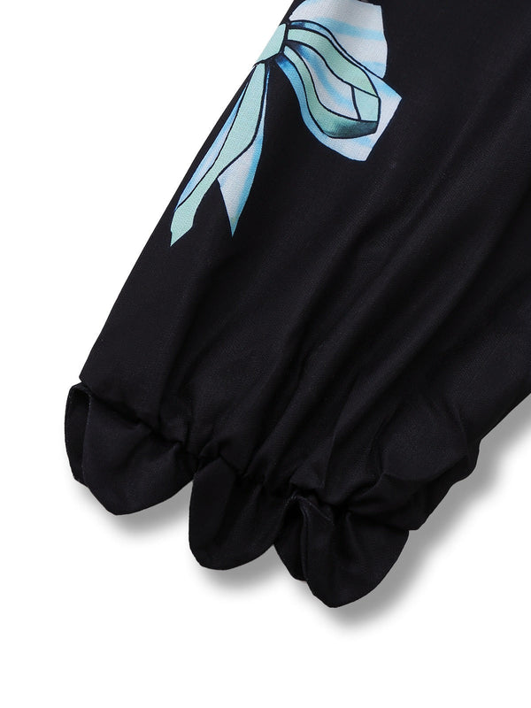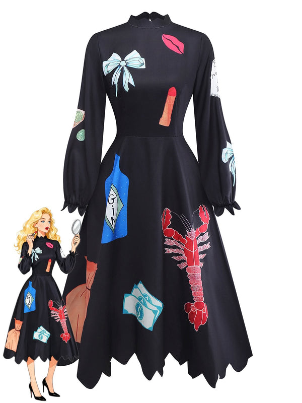 Robe imprimés de homard manga col zigzag manches lanternes noire année – Retro Stage-France