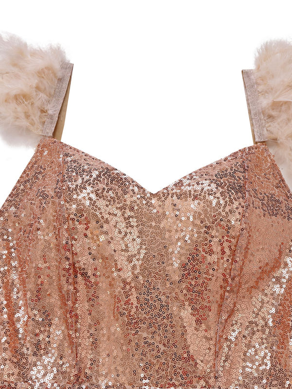 Robe sequins col en V bretelles à plumes fente haute années 1930
